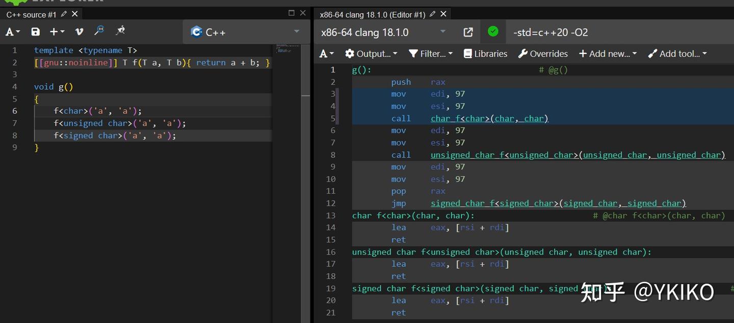 可以看见就像被 inline 标记的函数那样,这两个编译单元都实例化了 add<int, int> 和 add<double, double>,各有一份代码。然后在最终链接的时候,链接器只为每个模板实例化保留了一份代码。那我们尝试打开 -O2,然后再看看情况。结果 如下