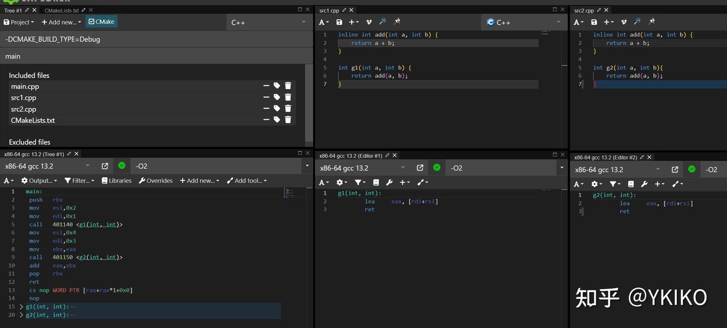尝试编译链接上面的代码。发现不开优化可以链接通过。开了优化就会导致链接失败了。链接器会告诉你 undefined reference to add(int, int)。三大编译器的行为都是如此,具体的原因上面已经解释过了,开了优化之后,编译器压根没生成 add 这个符号,链接的时候自然无法找到了。