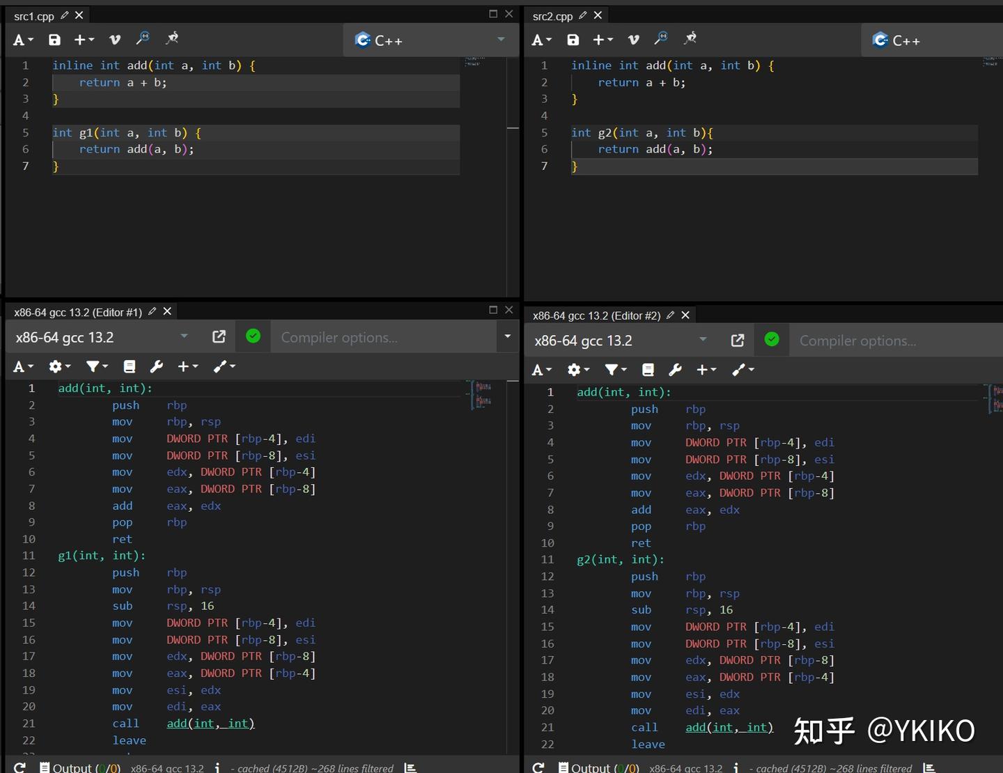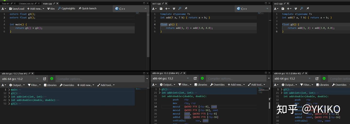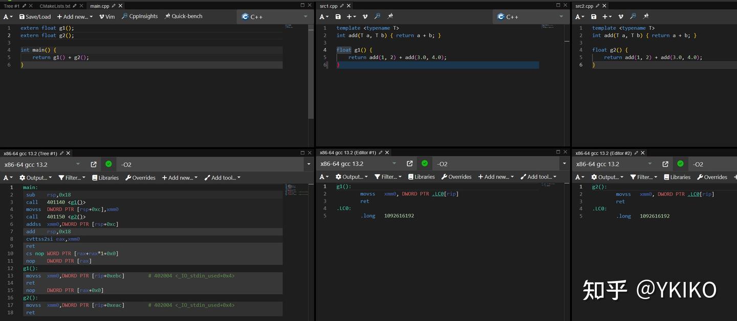发现链接器只保留了两份 add 实例中的一份,所以并没有额外的代码膨胀。并且 C++ 标准要求,内联函数在不同编译单元的定义必须相同,所以无论选哪一份代码保留都没区别。但是如果你问:万一定义不同呢?那就会导致 ODR 违反,严格意义来说算 undefined behavior,究竟保留哪一个可能就看具体实现了,甚至和链接顺序有关。关于 ODR 违反相关的内容,我最近可能会单独写一个文章介绍,这里就不说太多了。只需要知道 C++ 标准保证 inline 函数在不同编译单元定义相同就行了。