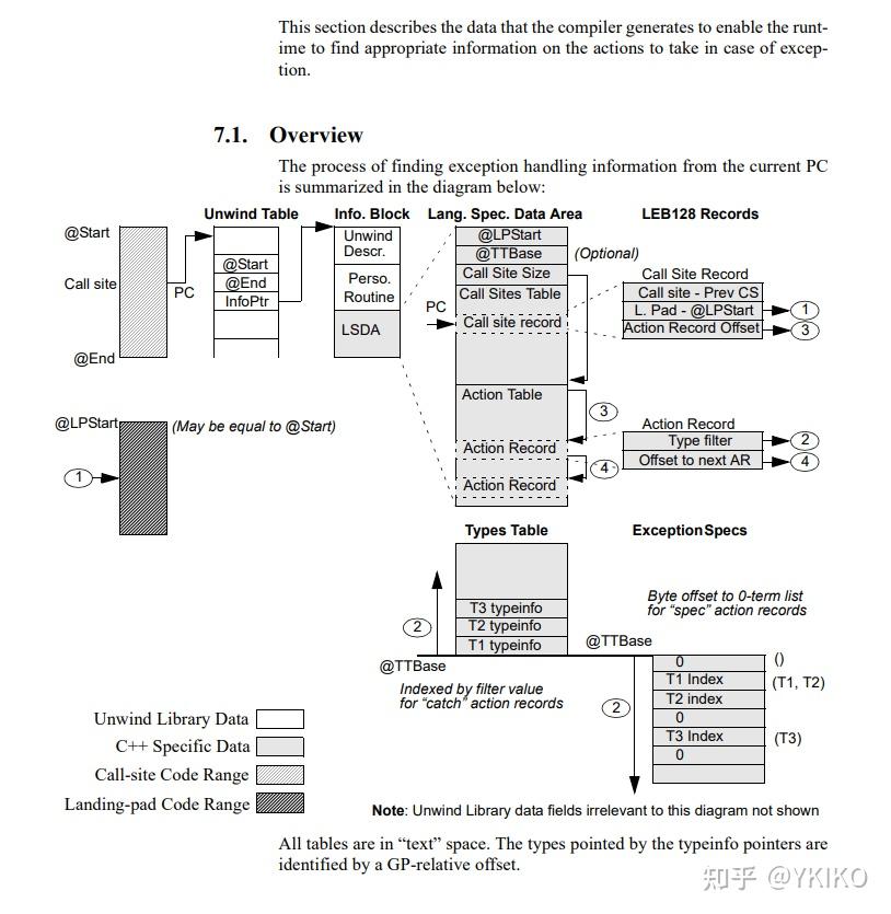 目前主要的异常实现有两种,一种是 Itanium ABI 的实现,另一种则是 MS ABI 的实现。简单来说 MS ABI 采用运行时查找的办法,这样会导致异常在 Happy Path 执行也有的额外运行时开销,但是优点是最终生成的二进制代码相对较小。而 Itanium ABI 则是我们今天的主角,它号称零开销异常,Happy 路径没有任何额外的运行时开销。那古尔丹,代价是什么?代价就是非常严重的二进制膨胀。为什么会产生膨胀呢?简单来说,就是如果不想完全等到运行时去查找,那就得预先打表。由于异常的隐式传播特性,会导致表占用空间很大。具体实现细节非常复杂,不是本文的主题,放张图,大概感受一下