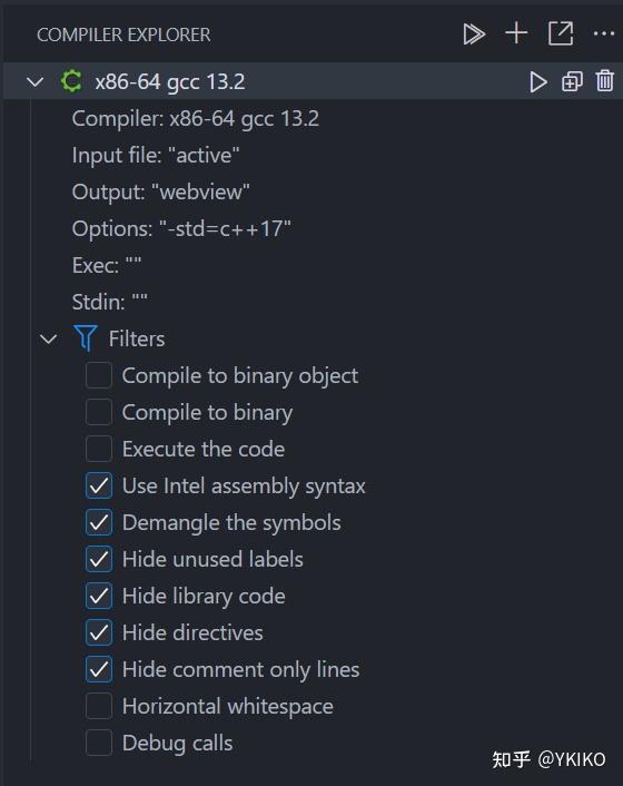 Compiler:点击右侧的按钮可以选择编译器版本Input:选择源代码文件,默认是active即当前活跃的编辑器Output:输出编译结果的文件,默认使用webviewOptions:编译选项,点击右侧按钮可以打开输入框Execute Arguments:传递给可执行文件的参数Stdin:用于标准输入的缓冲区Filters:一些选项